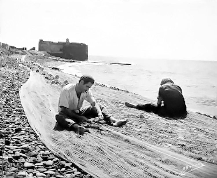 FOTO: Barrio de Los Llanos: "Eliseo y otro primo llanero arreglando los trasmallos en La Playa y con el Castillo Negro". Años 70 aprox.". Grupo Facebook Fotos Antiguas de Tenerife.