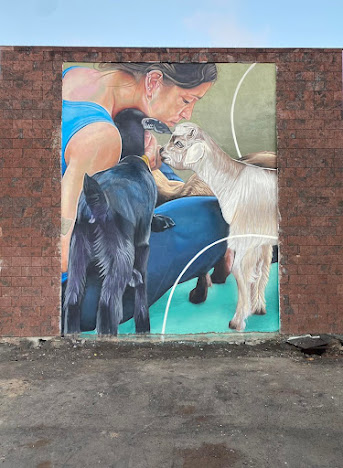 La entrada tiene este encabezado: "Primer mural del año para el centro de interpretación del Queso y el pastoreo en Alajeró La Gomera. Muchas gracias Cecilia y Sixto de El Silvo Construcciones por la atención y a Brenda Rodriguez Concepcion por inspirarme para esta obra: Bienestar animal. ¡¡¡Muchas gracias Alajeró, La Gomera!!!". (A lo largo de la entrada iré intercalando imágenes de este mural como ejemplo de su obra).